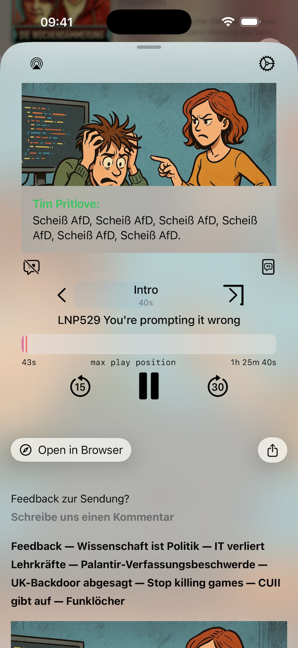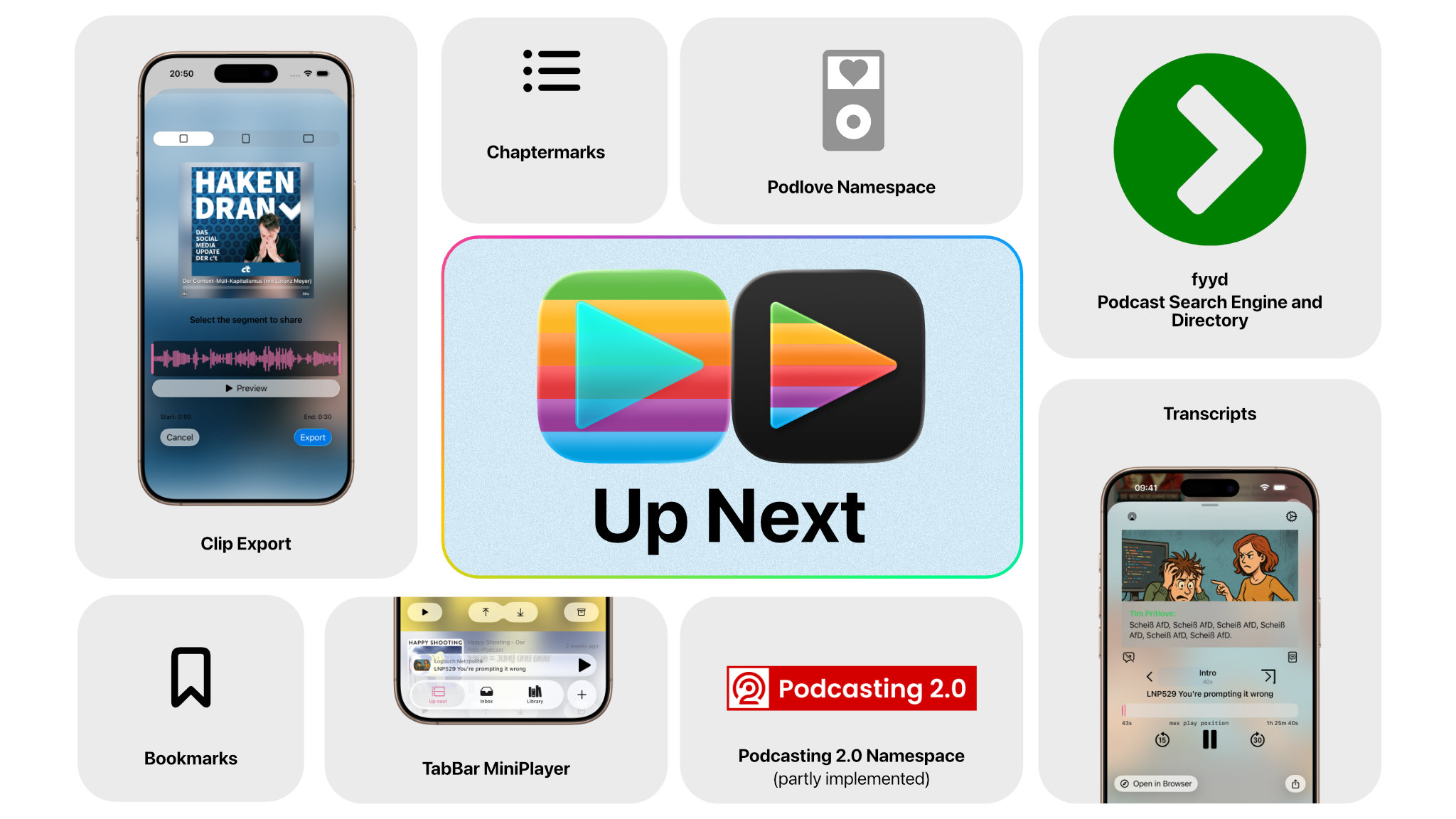 Up Next is completely free to use and always will be. It’s built on community-driven projects like fyyd, and the full code is open source. No subscriptions, no ads, no limitations—just podcasts.